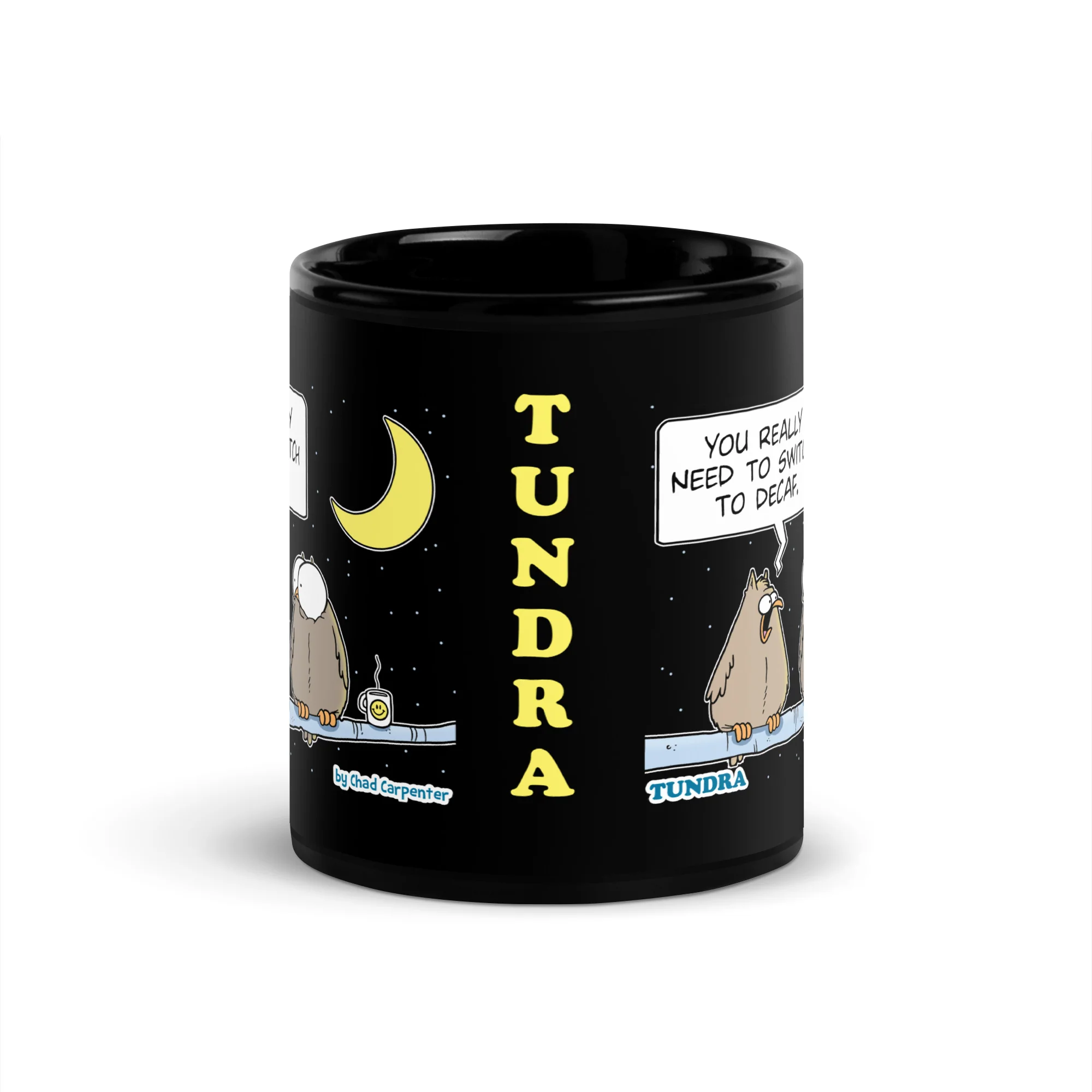 If you think your morning coffee makes your eyes pop, wait until you see this owl. Featuring a classic TUNDRA comic, this mug shows one jittery, wide-eyed owl who’s clearly on his 47th cup of joe, while his calm perch-mate suggests the unthinkable… decaf. Perfect for caffeine junkies, night owls, and anyone who thinks “sleep” is just a rumor. Warning: using this mug may cause uncontrollable laughter and an inability to blink.