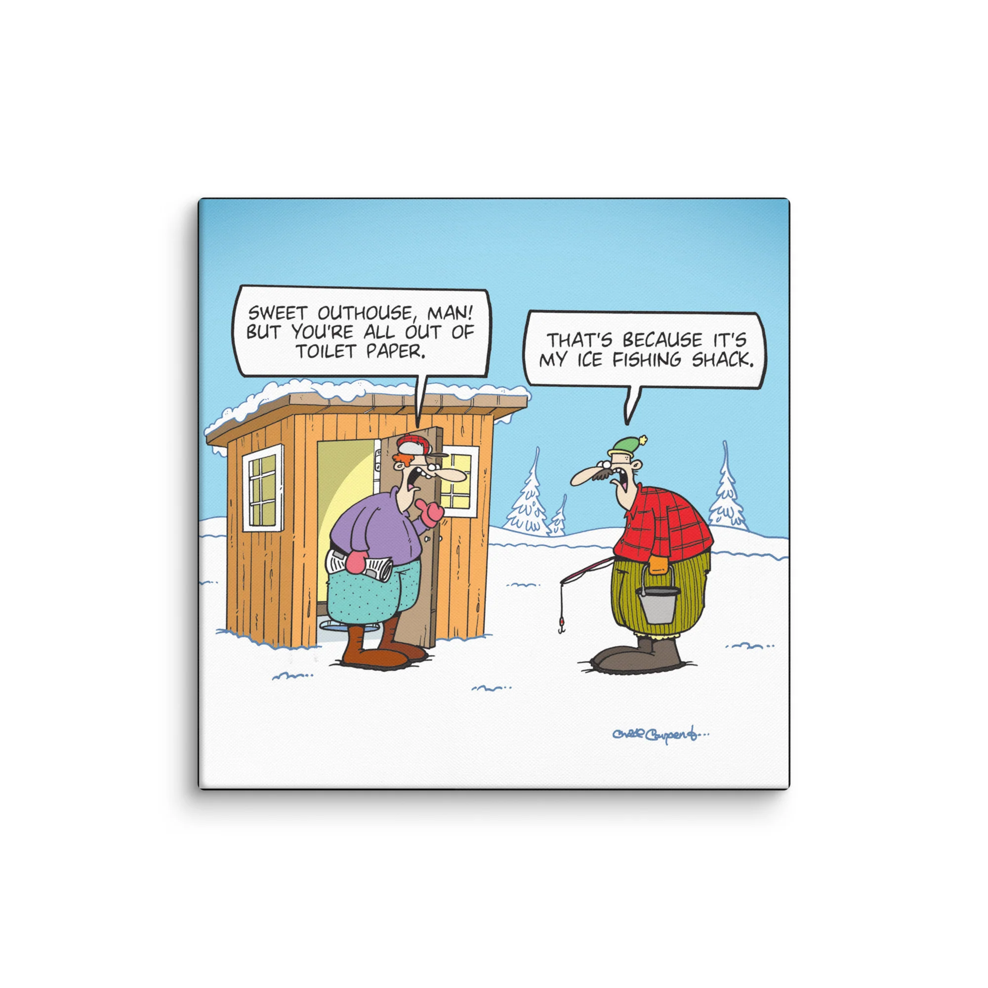 Add some ice-cold comedy to your wall with this hilarious Tundra Comics stretched canvas. Printed on premium-quality canvas and stretched over a solid wood frame, this funny cartoon is perfect for ice fishing fans, outdoor enthusiasts, or anyone who’s experienced a frosty misunderstanding.